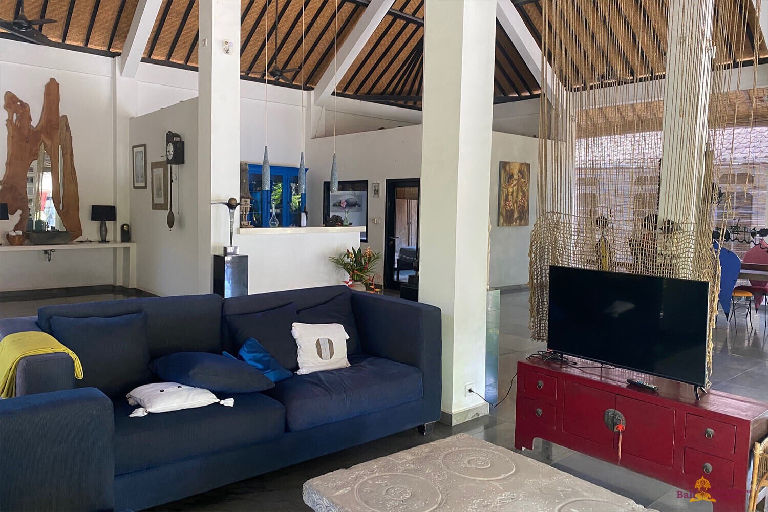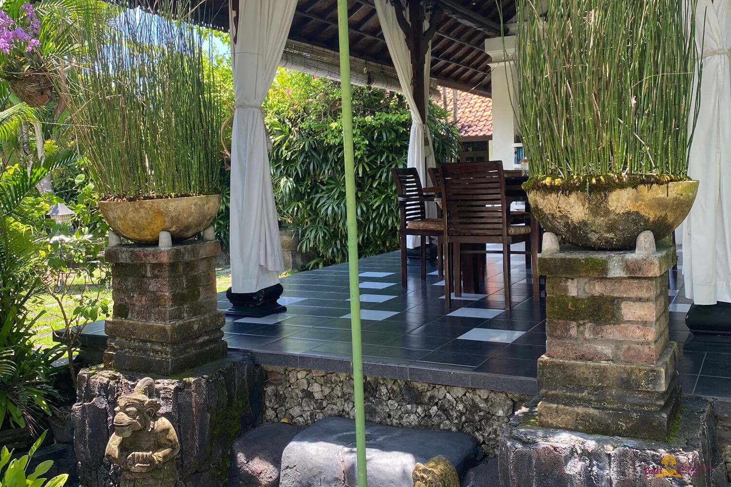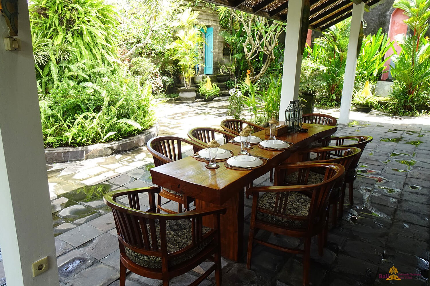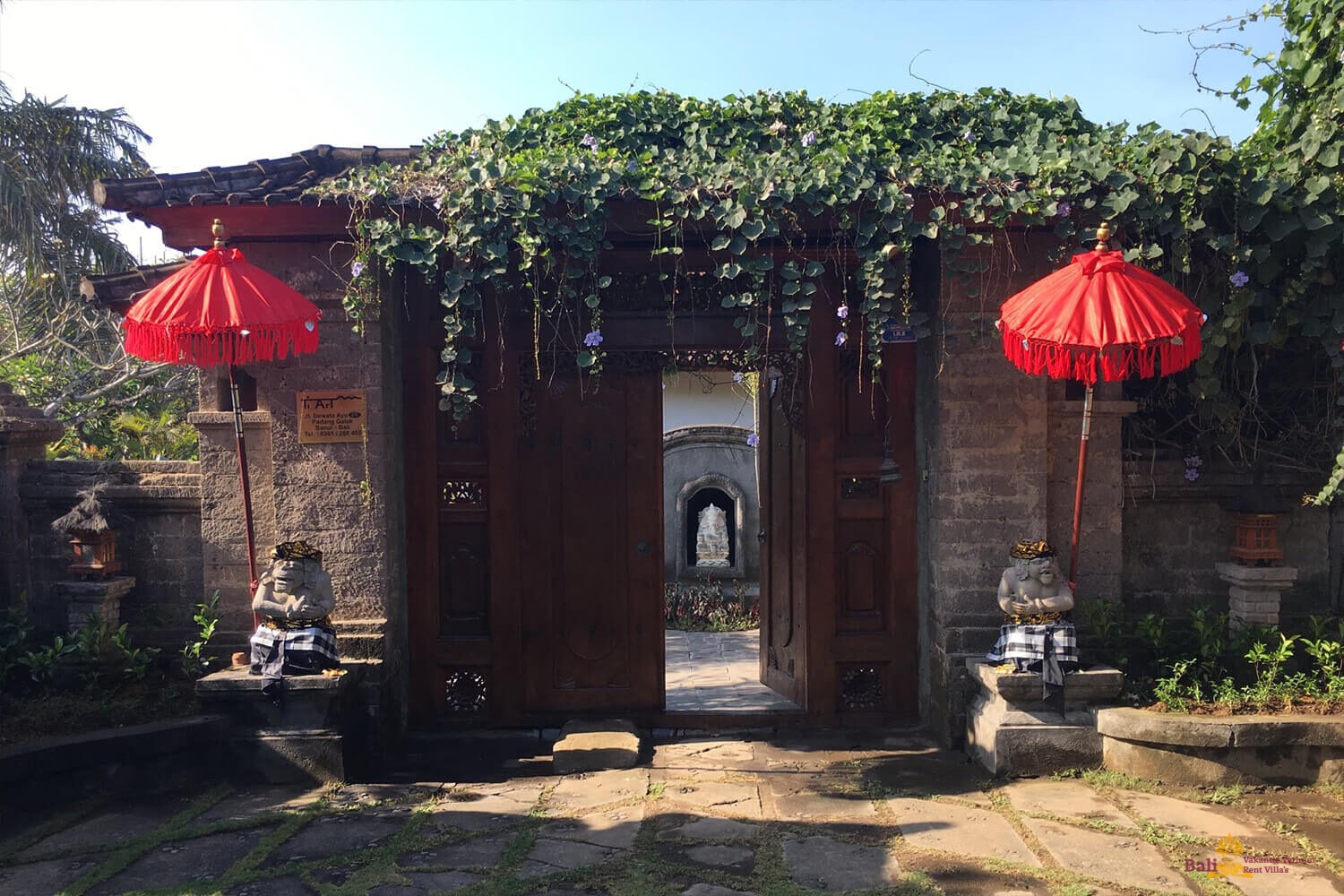 The Ti-Art Villa has an artistically decorated open Living (140 m2) with a kitchen, a large dining table for 12 people, toilet, sink and a bedroom with two single beds. Adjoining a covered terrace (60 m2) with a table and 8 chairs. The other 3 bedrooms – each with a double bed – and two bathrooms are located in the adjacent sleeping house. The closed fully equipped kitchen with covered terrace is also separate with a view of the garden and the swimming pool. The swimming pool is kidney-shaped (5 x 8.5 meters) and has stairs and a maximum depth of 1.60 meters. Seat cushions, mattresses and towels are provided. From Monday to Saturday from 8 am to 4 pm our head housekeeper Kadek is present, she takes care of the cleaning and maintenance of the villa. If desired, she can prepare a delicious Indonesian meal for you at cost price. Private driver Agous is available on call for a fee. Agous has been organizing trips and excursions for 20 years and will show you the real Bali. There are also four free bicycles at the villa with which guests can explore Sanur and the surrounding area.