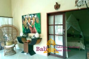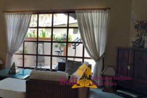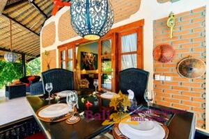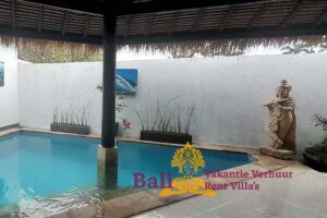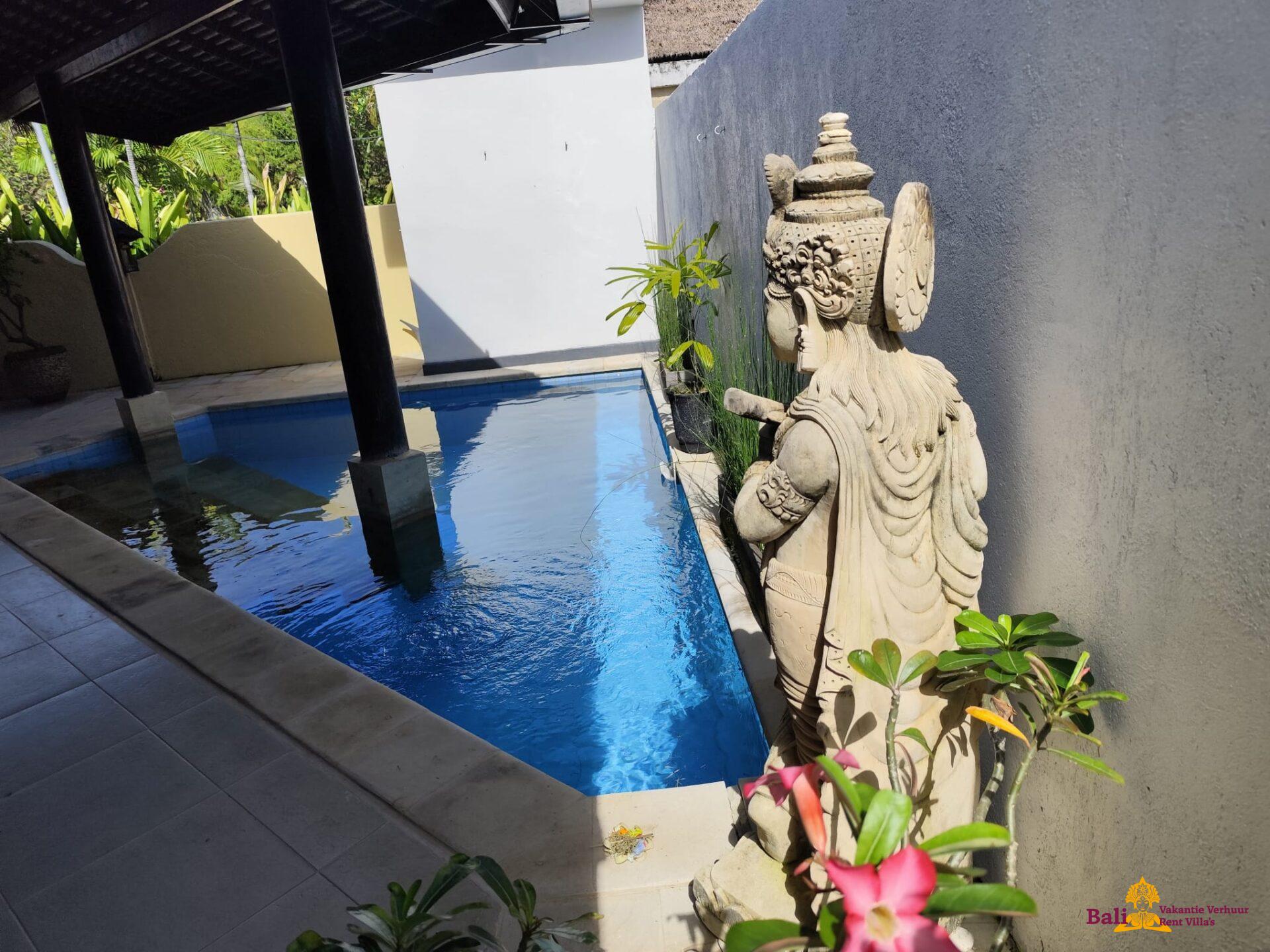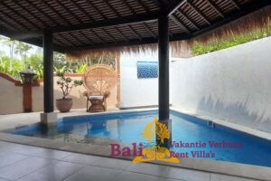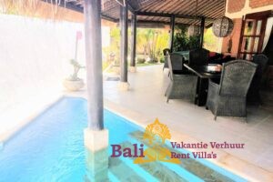 Een overdekt terras met aanliggend klein zwembad en een bijna altijd aanwezig zeebriesje zorgen voor een aangename koelte. Er zijn twee ligbedden om te zonnen en twee zitkussens. In de schaduw op de bale benong (een traditionele rustplaats) is het heerlijk mijmeren en relaxen met een tropische cocktail en een goed boek.